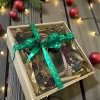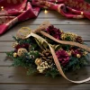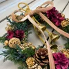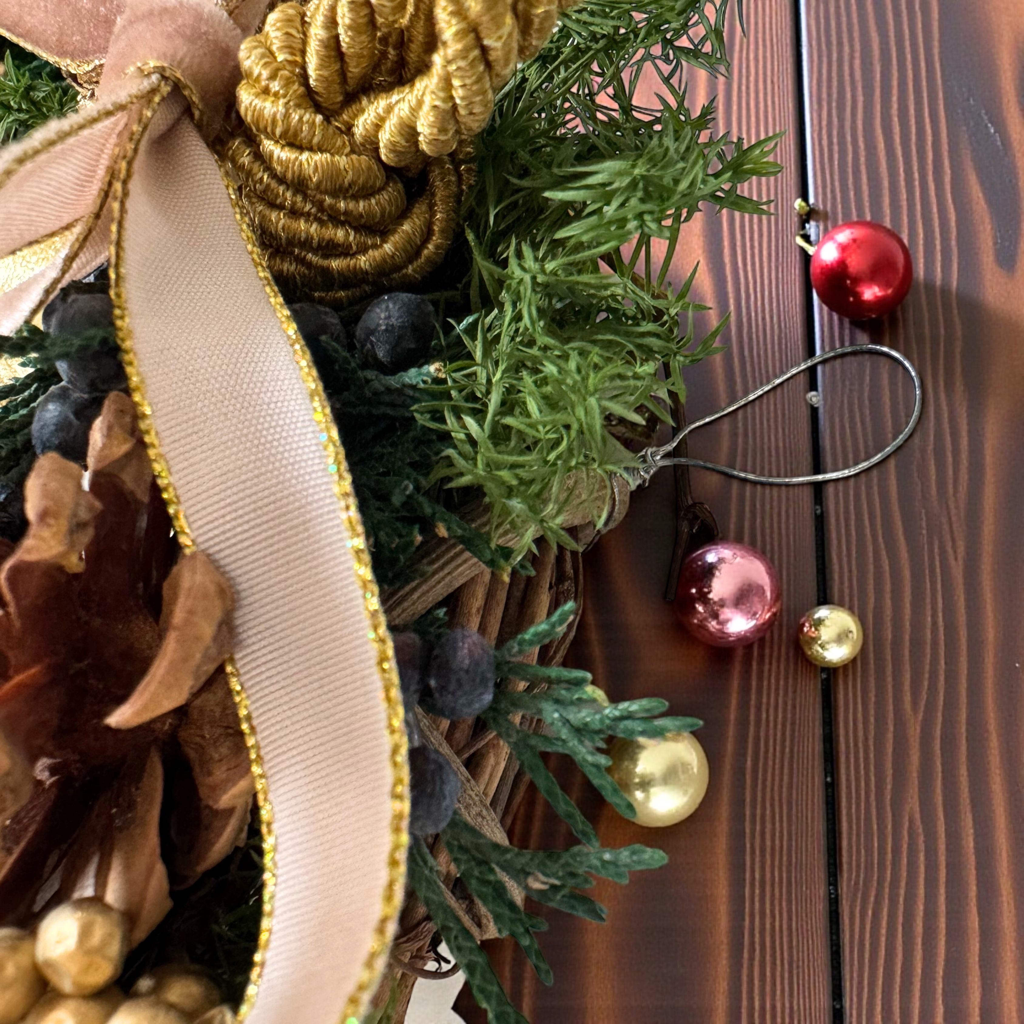 ヒムロスギやマウンテンジュニパーなど、クリスマスらしい深いグリーンをベースに、複数色のマツカサ、ペッパーベリー、そしてゴールドのオーナメントを贅沢にあしらった、華やかさと上品さを兼ね備えたクリスマスリースです。