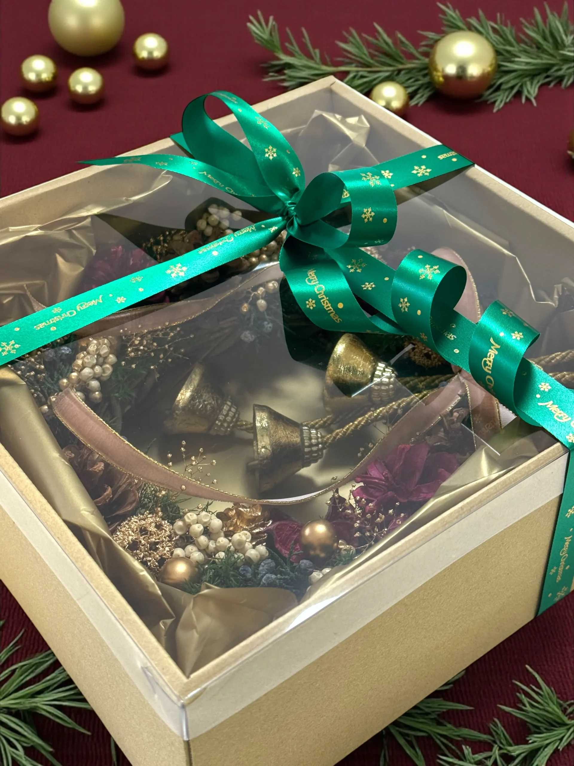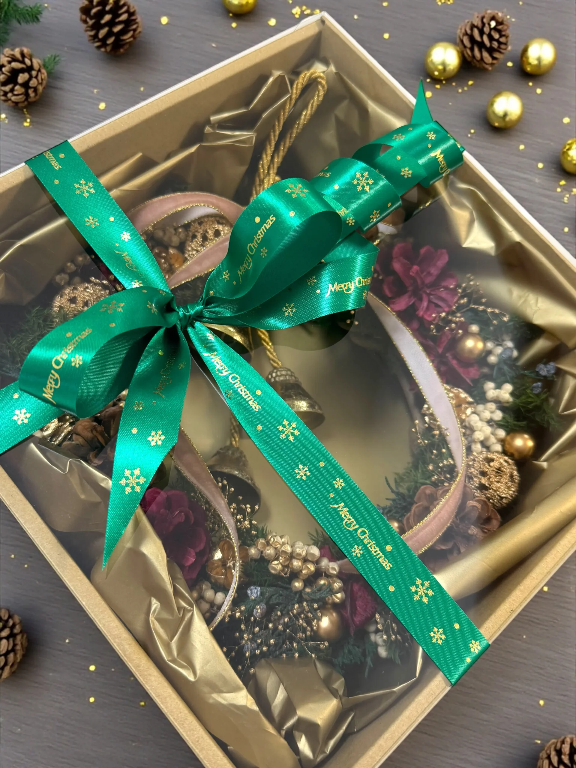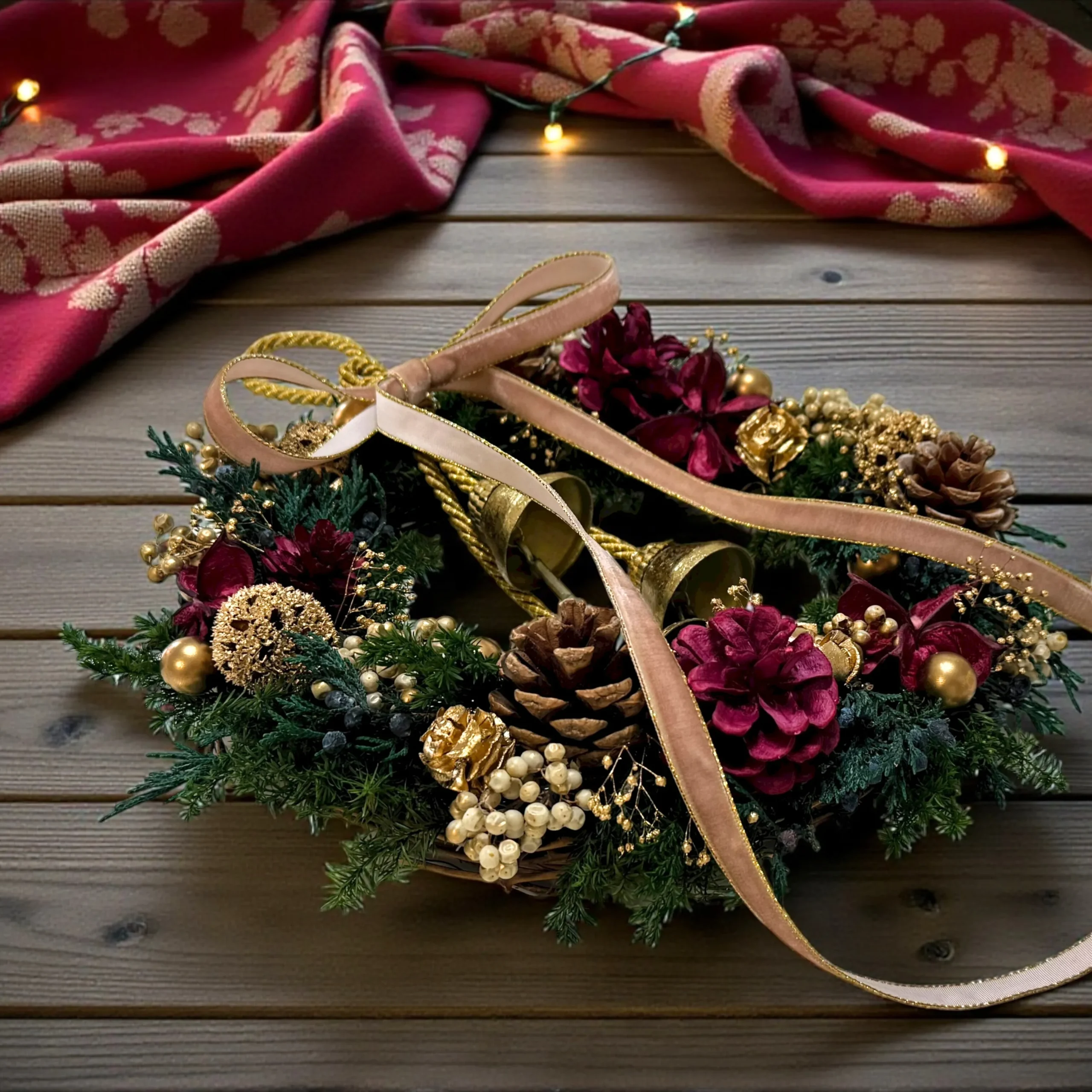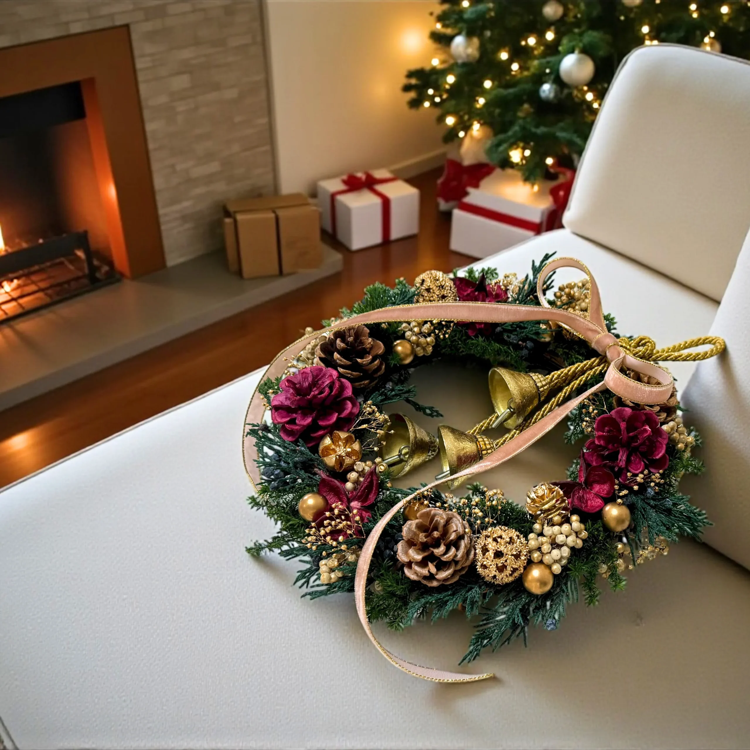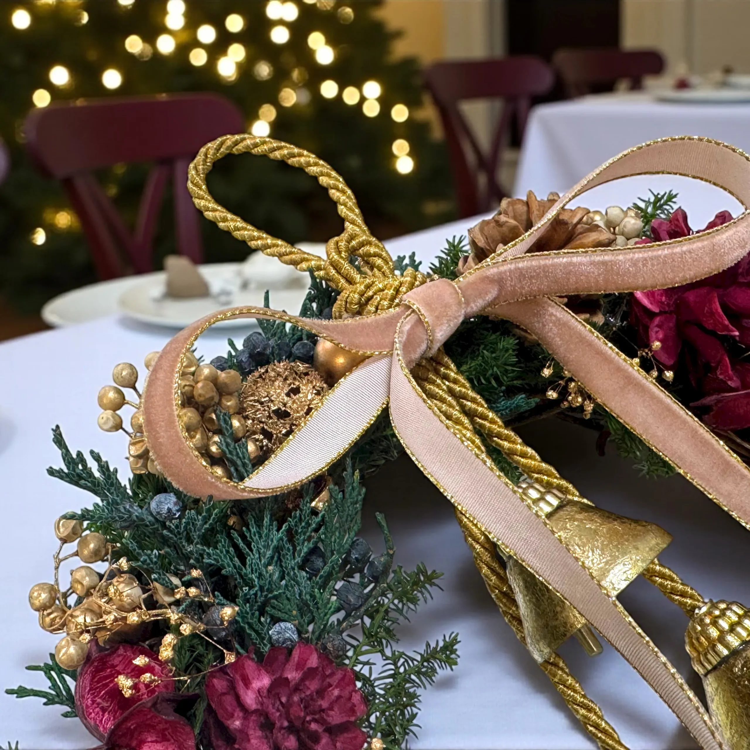 揺れるベルと光沢のあるリボンがアクセントとなり、お部屋や玄関に飾るだけで、特別なホリデーシーズンの雰囲気を演出してくれます。