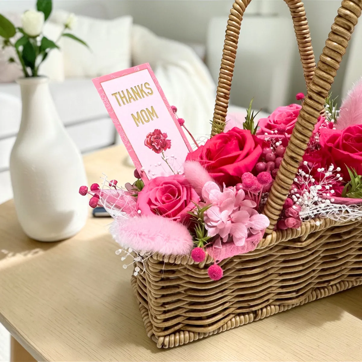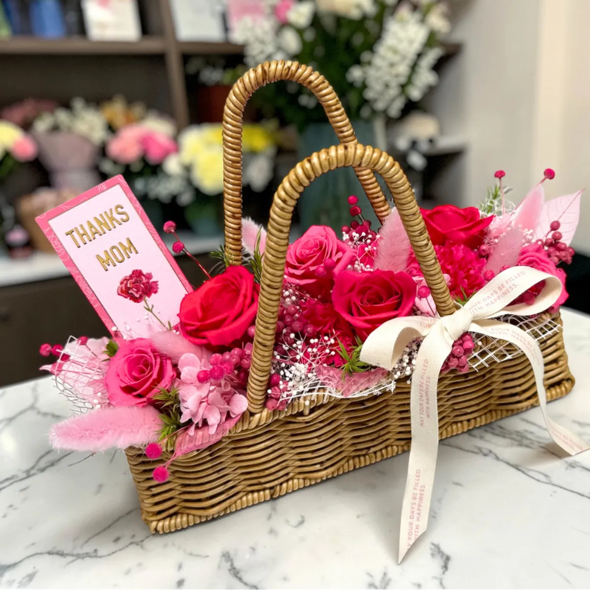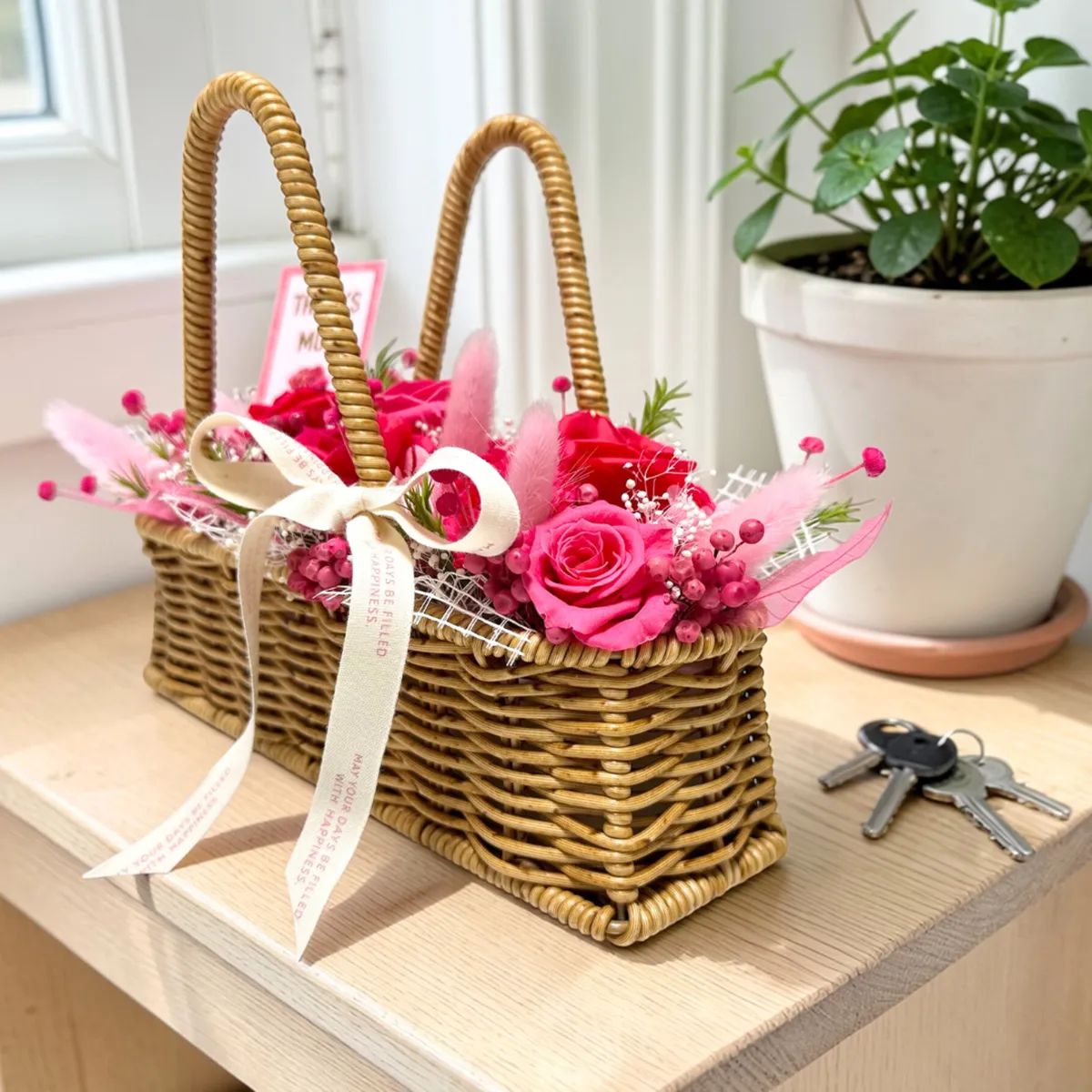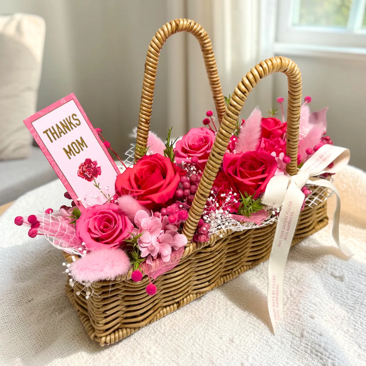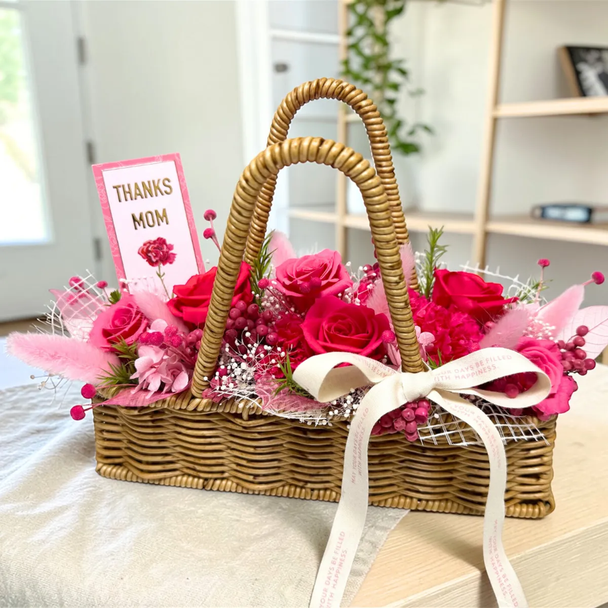 温かみのあるナチュラルなバスケットとリボンが、母の日の特別なギフトをより一層引き立ててくれます。